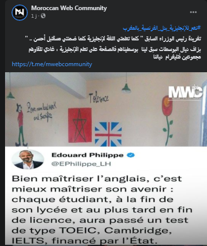كما عزز أصحاب حملة “نعم للإنجليزية بدل الفرنسية بالمغرب” مطالبهم بمقولات لشخصيات فرنسية معروفة والتي أقرت بعدم فاعلية اللغة الفرنسية، وعلى رأسهم إدوارد فيليب، رئيس الوزراء الفرنسي السابق، الذي أكد في تغريدة على حسابه في تيويتر، على أن” تعلم الانجليزية هو الطريق الصحيح لضمان مستقبل أفضل”.